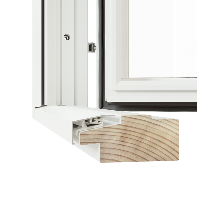 Harmoni inåtgående fönsterdörr erbjuds med två tröskelalternativ, här visas den lägsta varianten. Tröskel i trä med utvändig del av aluminium, höjd 48 mm.