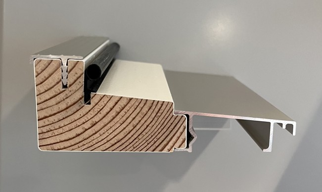 Harmoni 2+1 utåtgående fönsterdörr erbjuds med tre tröskelalternativ, här visas den högsta varianten. Tröskel i trä med utvändig del av aluminium, höjd 42 mm.
